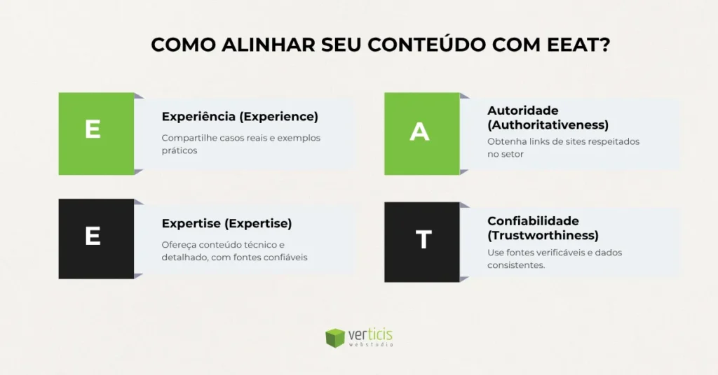 - E-E-A-T: experiência, expertise, autoridade e confiabilidade no conteúdo e no autor.